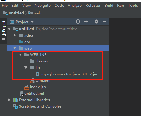 (3)在WEB-INF下新建两个文件夹,分别是classe和lib,并把mysql-connector-java-8.0.17.jar放入lib文件夹下