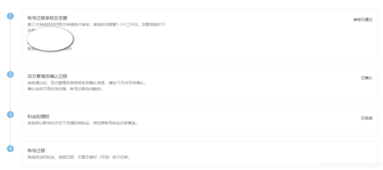 4)1天后自动触发迁移,包括粉丝、群发素材、违规记录,时间随迁移量大小,将在1-3天内完成;
