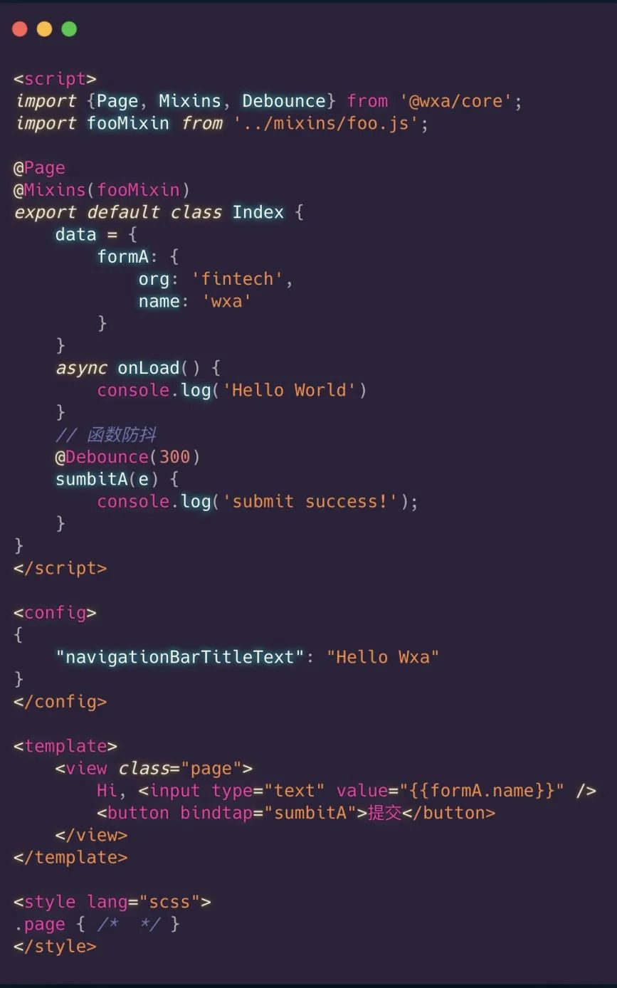 wxa 基于 AOP 的思想,使用装饰器(运行时改写,拦截)和预编译等手段在不侵入小程序基础接口的前提下提供开发增强能力,按需引入,即插即用。专注于小程序原生开发,既保留小程序简单入门、快速开发的特点,同时提供一系列能力,解决工程化、代码复用的痛点,提高开发效率并改善开发体验。