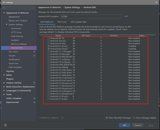 直接下载android-studio,下载地址:http://www.android-studio.org/,安装完成后选择所需对应安卓环境(及手机真机或安卓模拟器对应的相关安卓版本)