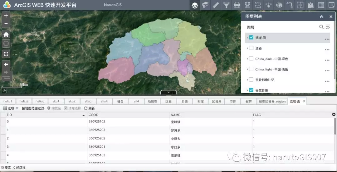 属性查看模块:右键图层管理,查看属性表,弹出属性控制面板,可以过滤字段,只显示当前视野数据,双击定位,点击查看内容属性。