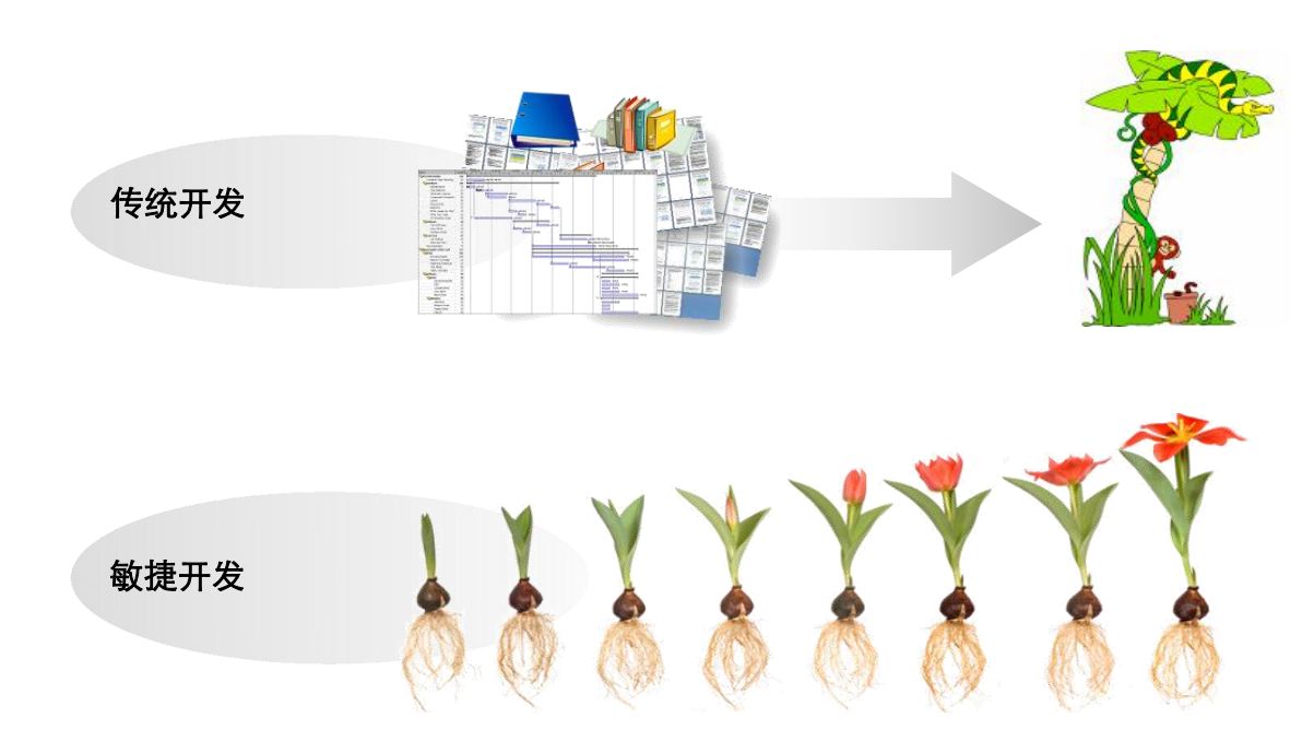 软件更像一个活着的植物,软件开发是自 底向上逐步有序的生长过程 ,类似于植物自然生长 敏捷开发 遵循软件客观规律 ,不断的 进行迭代增量开发 ,最终交付符合客户价值的产品 什么是敏捷软件开发 ? 敏捷开发是一个 概念框架 ,这个概念框架是由满足 敏捷宣言的价值和原则的一系列方法和实践组成 , 敏捷开发 不是固定的【没有固定的步骤,比如你自己的房子你随意的装修,看你的心情】,它是由自我管理、不同功能的团队一起合作,在满足团队自身环境的一系列实践和方法之上,逐步演化而来。1.敏捷开发浪潮