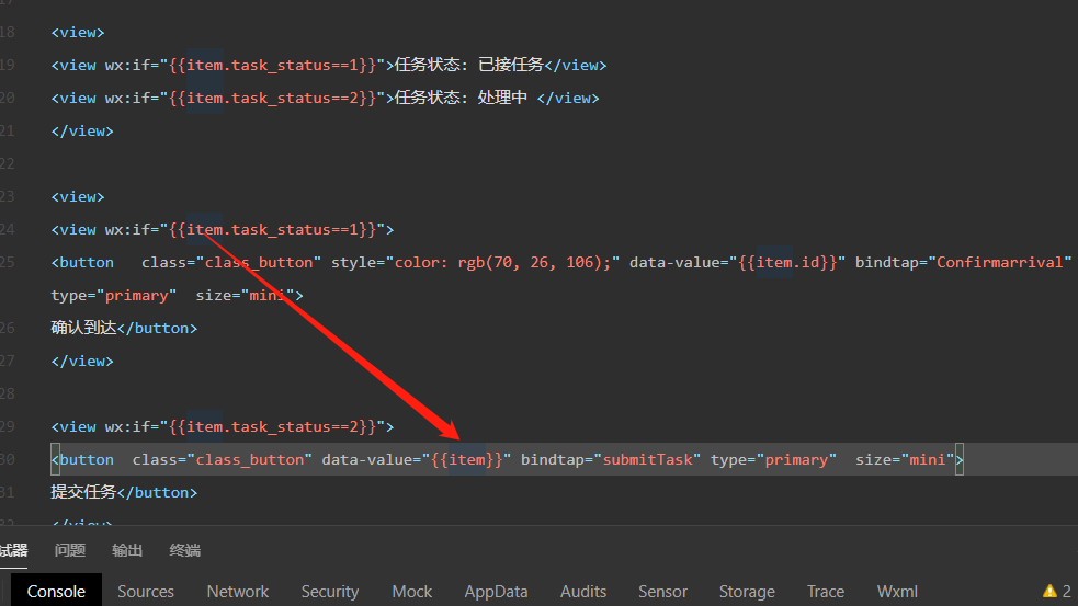 <button class="class_button" data-value="{{item}}" bindtap="submitTask" type="primary" size="mini">提交任务</button>