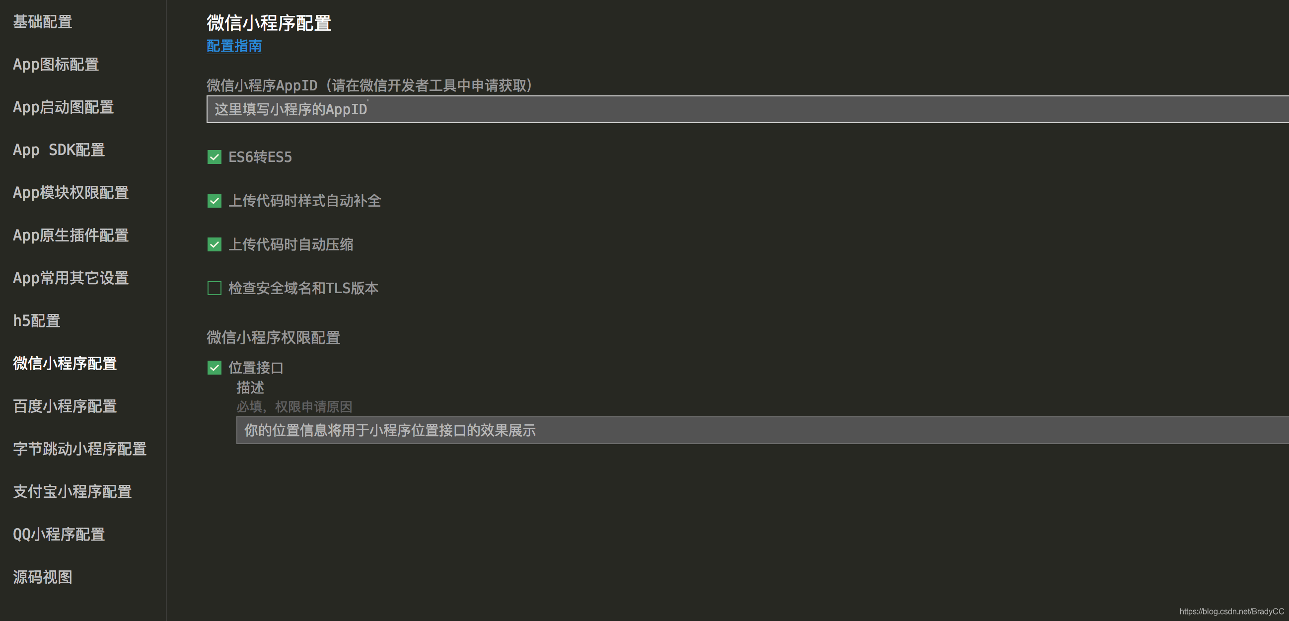1.在 manifest.json - 微信小程序配置 - 填写微信小程序AppID、选择位置接口,填写申请原因